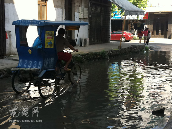 记者在海港路427号门前看见,西南新村出口的位置,还是“一片汪洋”,积水地段约3米宽,15米长,积水达到了10多厘米深。这里是西南新村主要出口处,过往车辆较多,不管是电瓶车、三轮车,还是机动车,经过积水处时虽然放慢了行驶速度,但还是溅起了高高的水花,速度稍快的车辆,溅起水花达到一米多高,人行道上的行人都是瞻前顾后的前行,车辆还在很远的地方,行人便开始躲闪,而行人过马路都得从地势较高的路面绕过去。