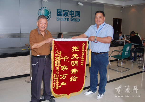 龙网6月3日讯:(通讯员 陈君 丁晨)6月2日上午,龙港供电所营业厅走进一位年迈的老人,只见他满面笑容,手里还拿着一面“把光明带给千家万户”的锦旗和两个红灯笼,嘴里笑着说道:“太感谢你们龙港所了,因为你们的认真负责,我们才能这么快用上电!”