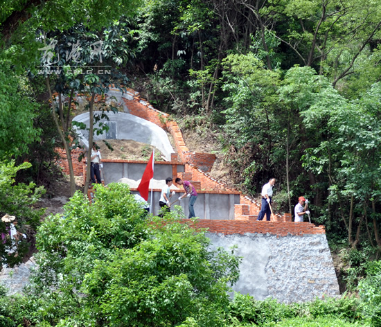 记者在下湾村的山上看到,许多坟墓看上去似乎都刚修建不久,而一些还没有完工的椅子坟上面,砖块、水泥等摆满了一地。工作人员针对这些重新修建的坟墓,利用铁锹、铁锤等工具,发现一处,强拆一处。