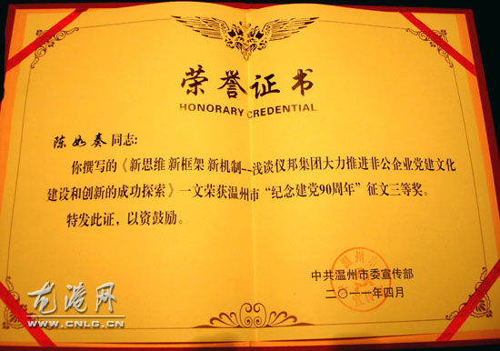 在党的生日来临之际,各地、各有关部门、在温高校等单位的党员干部和理论工作者等经过精心调研,撰写论文203篇,向党的生日献礼。经专家学者和有关领导的联评会审,共评出获奖论文50篇,分一、二、三等奖和鼓励奖进行表彰。陈如奏《新思维 新框架 新机制——浅谈仪邦集团大力推进非公企业党建文化建设和创新的成功探索》一文荣获优秀论文三等奖,并收入《思辩与实践——温州市纪念中国共产党成立90周年优秀论文集》。该文以汇报与解读的形式,分三个方面论述仪邦集团大力推进非公企业党建文化建设和创新的主要实践,从新的视角介绍非公党建一直走在全国前列的“温州经验”。第一、在与时俱进谋发展中,开启非公党建“新思维”,把非公企业党建文化建设和创新提上议事日程。第二、在通观全局明思路中,构建党建文化“新框架”,用党的创新理论指导非公企业科学发展。第三、在大胆探索理招数中,建立规范运作“新机制”,着力提高非公企业党建工作科学化水平。文章重点对仪邦集团“党建文化的初步构建”核心内容,即:“政策法规的宣贯”、“价值观念的培植”、“行为规范的引导”、 “人文环境的塑造”、“组织制度的构建” 五大框架,分别从理论与实践的结合上作了精辟阐述。