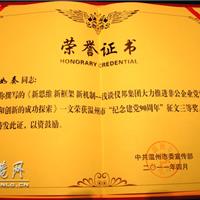 龙网6月20讯,温州市纪念中国共产党成立90周年理论研讨会在市人民大会堂四楼新闻发布厅隆重举行。会议就中国特色社会主义理论体系在温州的生动实践进行了深入探讨,对一批优秀理论研究成果进行了表彰。仪邦集团党委书记、政治处主任、副总裁陈如奏作为优秀论文获奖者代表上台领奖。