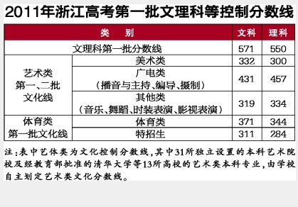 昨晚,浙江省2011年高考文理科第一批、艺术和体育类本科、高职(单考单招)最低控制分数线已经划定。今天起,考生可登录浙江省教育考试网、教育厅网站等,凭准考证号和姓名查询成绩;采用声讯方式查询的考生,电话可拨16885678,手机可拨12580或短信发送“CX准考证号”到10629500。