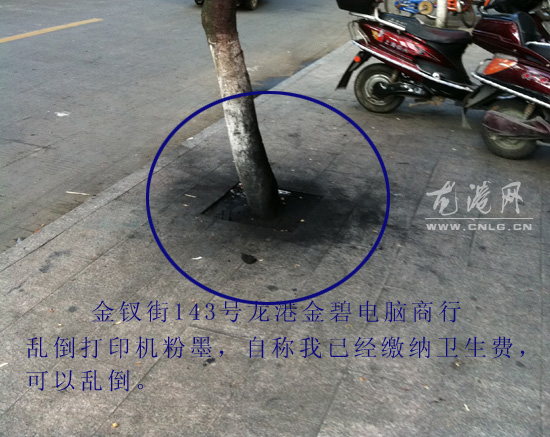 记者在这家电脑商行门前看到。人行过道树木上,有一些黑色粉末。周边居民称“过道上几乎每天都会有碳粉出现,”张小姐说,这家店经常将墨盒里的碳粉倾倒在过道树木上。而这条金钗街是主干道,居民每天都会走这里,“吸入碳粉对人体是有伤害的。”