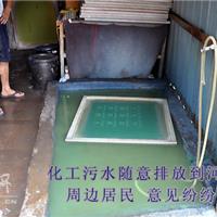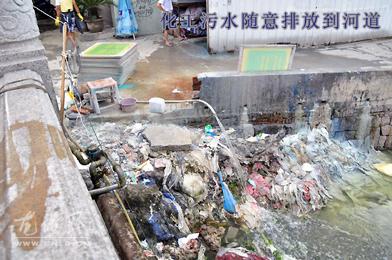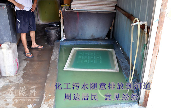 值班记者赶赴龙港镇海港路苍南县某标牌厂发现,河道边有一股呈绿白色的化工污水不断地淌入河道中。在污水口附近还有塑料袋、一次性饭盒、破烂衣服等大量生活垃圾。站在河边上便有一股腥臭的气味扑面而来。在附近一网民的指点下,记者发现旁有一处违章建筑钢棚,里面有一处水池,工人正在用化工药水清洗丝网印刷绷,绿白色的化工污水正在源源不断地流出。由于缺乏引流,这些污水直接从路面上流入河道中。