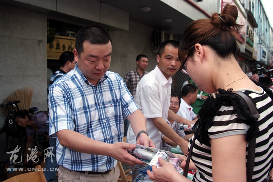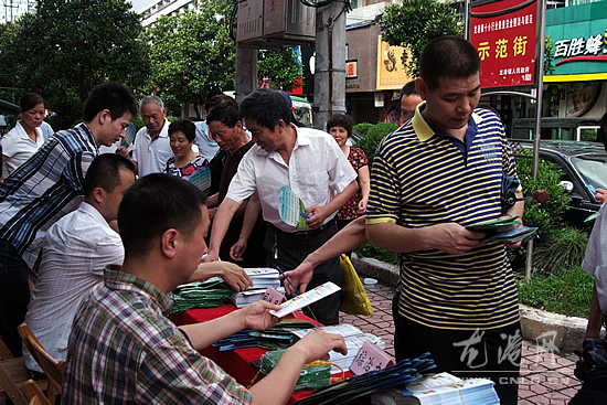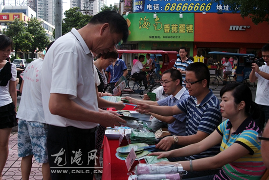 龙港镇委副书记、政法委书记黄建华向群众分发禁毒宣传手册
