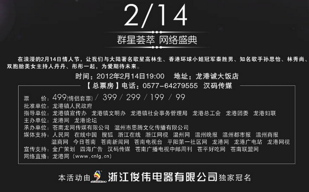 随着龙港及苍南、平阳地区经济、文化等领域的快速发展,2.14情人节倍受广大民众的喜爱与关注,我们举办《俊伟之夜》龙港群星演会,让我们分享浪漫与喜悦,也为地方文化倍增光彩。本次活动是我们历经数月精心策划,全力深度打造的大型主题活动。让我们同分享,共快乐!