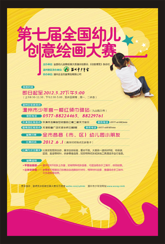 第七届全国幼儿创意绘画大赛(以下简称大赛)是由《幼教博览》杂志社主办的大型绘画赛事,为广大幼儿提供了表现艺术水平、展现美好心灵的平台。温州赛区由温州少年宫承办,将于2012年6月份开展选拔,届时,组委会特邀请幼儿绘画、美术专业方面的专家作为评委,以确保本次大赛评选的公平性以及评选结果的权威性。
