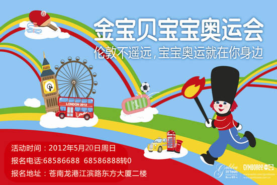 2012 年5月20日周日,金宝贝宝宝奥运会将把“伦敦”带到您身边。伦敦奥运会吸引的是全球的目光,金宝贝宝宝奥运会为全国0-5岁的宝宝带来自信、快乐和健康。5月份举行金宝贝宝宝奥运会的还有温州金宝贝、乐清金宝贝、瑞安金宝贝,福州金宝贝宝宝奥运会就在身边!