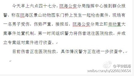 今天早上6点47分,瓯海公安分局指挥中心接到群众报警,称在瓯海区景山动物园东门桥上发生一起枪击案件,现场有一名男子受伤,伤势严重。接报后,瓯海公安分局立即启动重大案件处置机制,第一时间组织警力将伤者送往医院抢救,并成立专案组对案件进行侦查。目前伤者正在医院抢救,具体情况警方正在进一步侦查中。