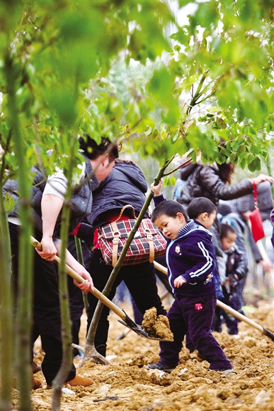 市民们挥锹、培土、浇水为市区瓯海大道植树种绿。苏巧将摄
