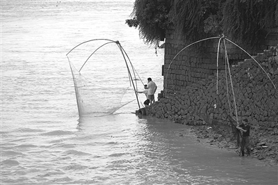 “苏拉”离开后,有市民乘着水闸放水,翻越栏杆下江捕鱼,十分危险。 苏巧将 摄