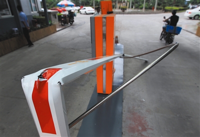 被折坏的拦车杆挂在小区门口。记者蒋超