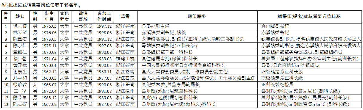 根据《党政领导干部选拔任用工作条例》和中共苍南县委《关于试行领导干部任前公示制的意见》(苍委发〔2005〕54号)的要求,现将县委常委会研究票决的拟提任或转重要岗位任职干部的有关情况予以公示,征求广大干部、群众意见。