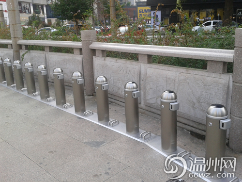 在控制器的旁边树立着20个清一色的不锈钢锁止器。据介绍,锁止器是取还自行车的工具,市民只须在锁止器顶部刷卡机轻轻一刷,将语音播报提示借还自行车流程。