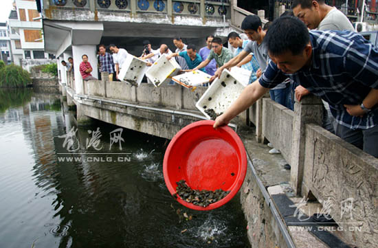 龙港网9月22日讯:(章国森)9月21日, 万尾中华鳖鱼苗放流于金乡护城河和灵溪横阳之江水域,用于恢复渔业淡水资源,改善生态环境。当地许多群众与县海洋与渔业局、金乡镇干部共同参加了鱼苗放流活动。
