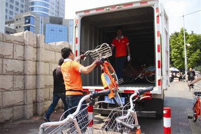 “医学院的车位满了,调度车司机过来运车,我要去把锁打开。”接到调度员的电话,街心公园的巡检员戴建文立刻骑上一辆自行车赶到。在医学院门口,他协助司机周师傅和搬运员徐师傅一起把一辆辆自行车抬上了调度车。周师傅告诉记者,他的车子一天要开80多公里,搬上搬下自行车600多辆。