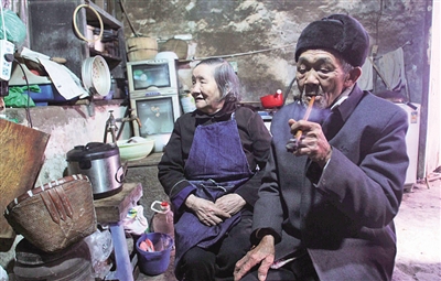 被年岁熏黑的灶台后,张超华老人捻一小撮自晒的旱烟塞进烟斗,点燃,一口一口沉默抽着。老屋内没有点灯,响晴午后也是昏暗的,火星一明一灭,照应着坐在他对面的老伴。她正坐在一张小板凳上,摸索洗涤午饭后的碗碟,身旁有另一把小板凳,代替她已残废的左脚。