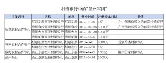 温姓村镇银行的跨区域经营始于福建福鼎恒兴村镇银行。2010年6月8日,由苍南农村合作银行主发起的该村镇银行在福建福鼎开业。它是温州银行业首次跨出温州走向外省的村镇银行。之后,由鹿城农村合作银行发起的、今年3月26日开业的江西安源富民村镇银行组建,它是温州银行业在中部省份设立的首家村镇银行。