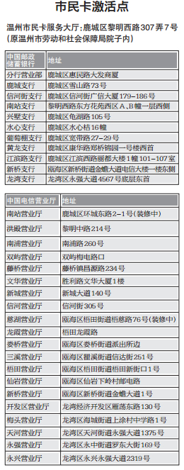 特别提醒在开通自行车借用功能之前,先要确保已经激活市民卡,市区有30余个网点(详见表格)可以办理,鹿城公共自行车服务大厅也增设了激活服务。