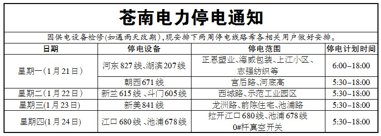 电力停电通知(1月21日-1月24日)