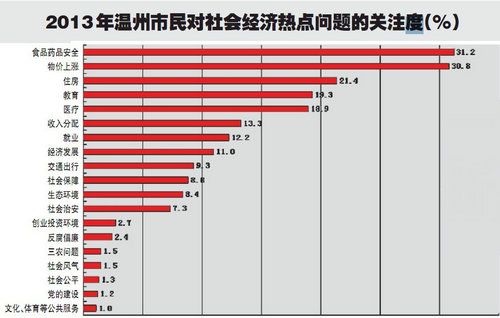 根据此次最新调查结果,并结合2005年至2013年以来温州市民最关注的十大问题的变化比较,记者从中发现,社会治安、生态环境等往年备受关注的问题今年均跌出关注度的前十位,交通出行也比去年下降五位,降至第九;而食品药品安全问题升至了今年关注度的首位。这些热点问题的位次升降之间,折射出近年来温州社会经济面貌的较大变化,但也反映出当前一些亟待重视的民生问题。
