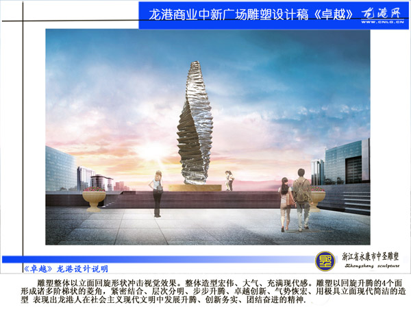 为加强城市有形文化建设,提升龙港城市建设品味,抓好龙港商业中心广场雕塑工程实施,规划要求在龙港商业中心广场建设城市主题性雕塑,龙港镇市场办坚持高起点规划的要求,组织相关设计单位认真进行项目和雕塑设计。经镇政府批准,2月18日,龙港镇市场办初步评选出5套雕塑方案公示,市民、网民积极参与评选,并提出一些合理建议,根据市民、网民的意见,3月26日,龙港市场办再次公布第二批2套雕塑方案,现进行公示。