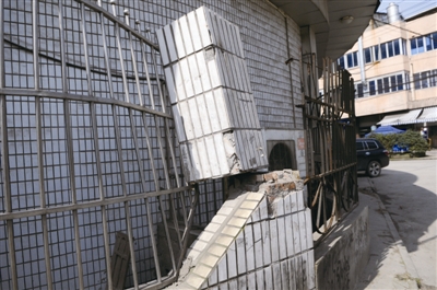 7.地址:温州时代医药有限公司(国鼎路与金达路交汇处) 现场:废旧广告牌上木板变形翘起,摇摇欲坠。就在下面,围墙的柱子断了,压着栏杆一起“后仰”。 点评:风大一点,这个片板就会被吹下来砸到人,还有这个柱子,行为艺术一样,随时会坍塌,在旁边走,我是很怕的!