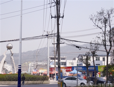 2.地址:金蟾大道和国鼎路交叉东南角 现场:多么“纠结”的电线杆!多么简单粗暴的架线方式! 点评:一根电线杆,暴露了我们城市化远远还没达标。