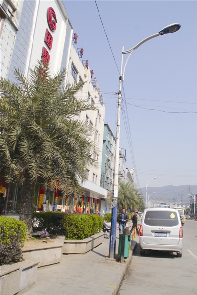 4.地址:国鼎百货前 现场:国鼎百货前的电灯柱上,从不同方向绕了一圈又一圈电线,有的电线是从临街楼房二楼屋里直接搭出来的。电插板就直接垂挂下来,毫无遮蔽。周围店家说这是晚上夜市上摊贩供电用的。 点评:就算有需要,也应该规范布置,如此也太随意了。沿街走着,到处都是避不开的电线,谁对市民安全负责?