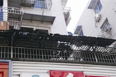 5.地址:国鼎路54号楼上(前花12组团11-1幢) 现场:二楼住户窗架上的铁皮雨棚生锈腐烂,中间有多处“留白”,部分雨棚有头无身,空留窗架裸露在外。 点评:你说这雨棚跟破布条一样,太难看了,雨都挡不住,留着有什么用呢?这不是路人头顶的不定时“飞刀”嘛,看着够悬!