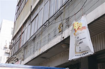 6.地址:国鼎路2号-6号 现场:绿色墙体上黄色的锈迹斑斑,玻璃窗上斑驳的贴纸,还孤零零地守候着几个拆走了空调的空调架。废弃招牌掉得只剩一个字,招聘布条还在迎风招展,仿佛在诉说这里的沧桑。 点评:有条件的话,大楼外立面都该翻新一下,脸总要洗洗的。空调拆了,要把空调架一起拆走,广告撤了就要撤干净,这样剩点那样剩点,好像鼻子下面挂着个鼻涕没擦干