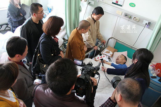 温州太平慈善龙港分会得知此事后,立即派员与本网取的联系,并到医院核实情况,释会长带领副会长、理事一行为朱文光送来2万元慰问金。