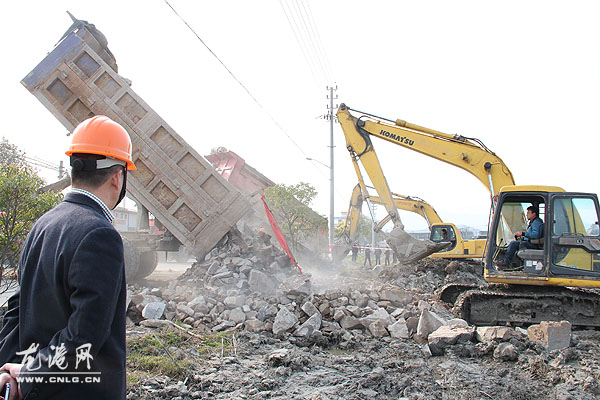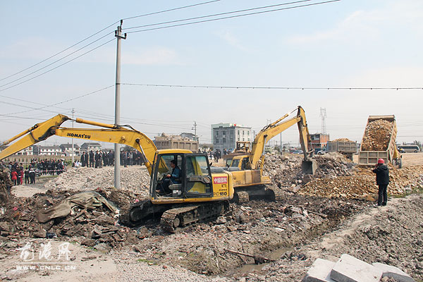龙港网3月13日讯:(陈记 摄 陈熙康 文)昨日上午,灵海公路龙港段沿线安置点工程正式进场施工。灵海公路龙港段沿线需建立7个安置点,在上午的都口村段施工过程中,尽管受到了个别村民阻挠,但是工程进场总体顺利。镇领导吕存阳、赵凯到现场指挥。