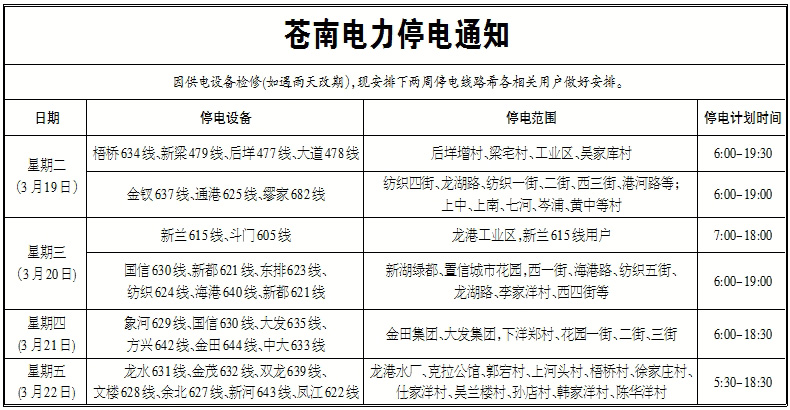 苍南龙港停电通知(3月19日—3月22日)