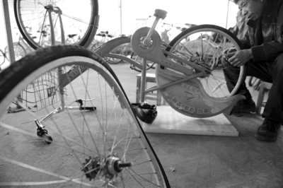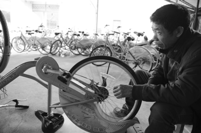 记者从服务中心了解到,尽管维修总数还没有详细的统计数据,但去年9月份新车上路以来,一个月后开始出现“病车”,平均一天大概四五十辆,最多的一天曾送回七十辆。在大院里,密密麻麻停着好几排挂着“故障保修卡”的自行车。每天都有两三名维修师傅给它们“治疗”。程师傅和陈师傅昨日值班,两位头也不抬地忙着工作,人均一天修十几辆车。