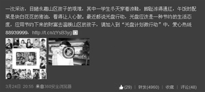 3月24日20点55分,我市媒体人方赞发出了这么一条微博:“一次采访,目睹永嘉山区孩子的艰难,其中一学生冬天穿着凉鞋,脚趾冻得通红,午饭时配菜是块白花花的猪油,看得让人心酸。最近都说光盘行动,光盘应该是一种节约的生活态度,应用节约下来的财富去温暖山区的孩子,请加入到‘光盘计划微行动’中。”