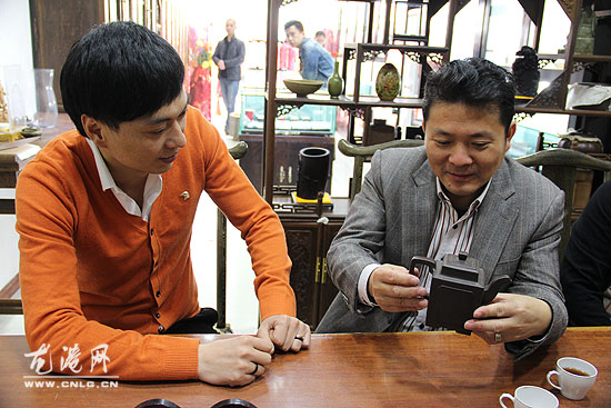 保德轩老板黄某(左)为收藏爱好者推荐大师级紫砂壶