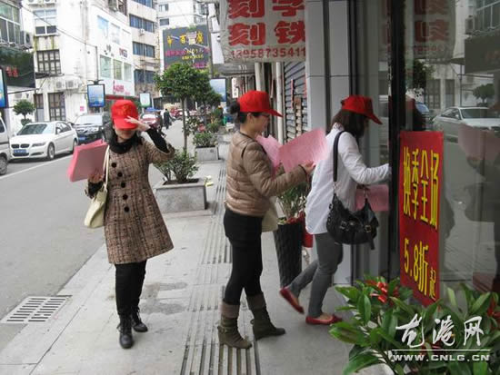 30名大学生村官准时在龙港镇政府大院集中,大家按照预先的安排有序的分为三组,并由各组小组长带队,大家分工明确。第一组负责向临街个体经营户发放诚信经营倡议书;第二组负责清理“牛皮癣”小广告;第三组负责拉交通宣传条幅倡导路人遵守交通规则。
