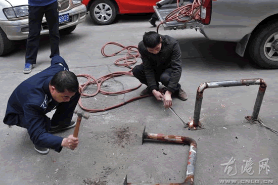 执法人员在拆除占道铁栏