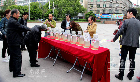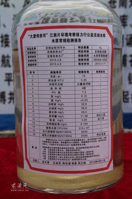 3月10日下午,主办方将采集的9条河流水样和水质报告放在龙跃广场进行展示,供市民浏览。