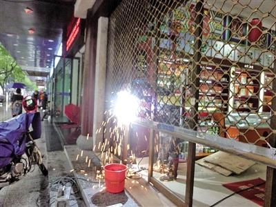 电焊工正在修理被破坏的卷帘门。 刘宏宇 摄