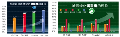 分年龄段调查显示,市民年龄越大,对绿化满意度越高。