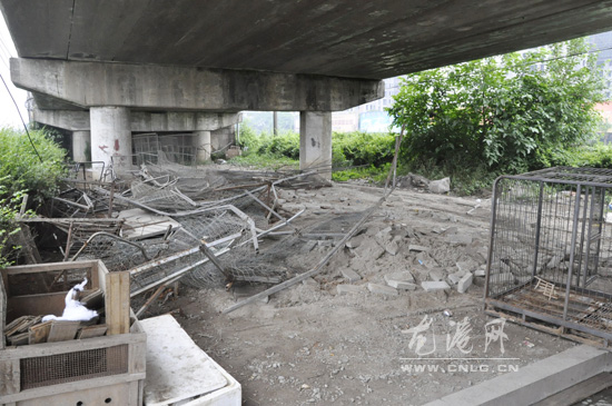 该狗场位于龙港大桥底下三间小平房内,大桥两边就是村民休闲锻炼身体的公园。记者在现场看到,狗场内摆满了狗笼,里面的各种宠物狗已经被动物防疫工作人员清理出去,屋内掉落的狗毛、排泄物、木板等杂物,脏乱不堪