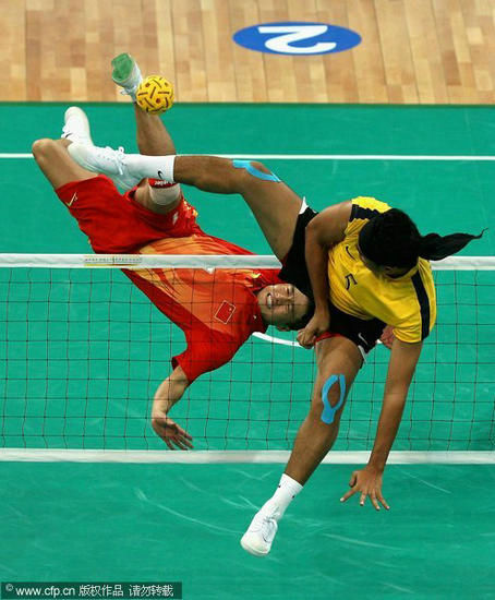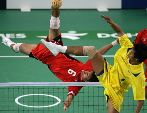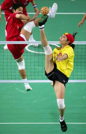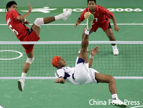 藤球跟排球赛有些类似,所不同的是以脚代手,所以又叫“脚踢的排球”。藤球运动源于15世纪的苏丹国统治下的马六甲一带地区。当时,人们在劳动之余,围成一圈,用头顶球、用脚踢球,使之不落地。这就是现代藤球运动的前身。这种轻松愉快、消除疲劳的运动很快便在东南亚一些国家传开了。缅甸、马来西亚、泰国和新加坡等国开展得较好。尔后,它又迅速地传入印度、菲律宾及马来西亚等地。泰国开展这项活动已经有几百年时间了。在缅甸,700多年前的蒲甘王朝时就相当盛行。作为民间的体育活动,它犹如中国的踢毽子,可做出 各式各样巧妙、复杂的动作。