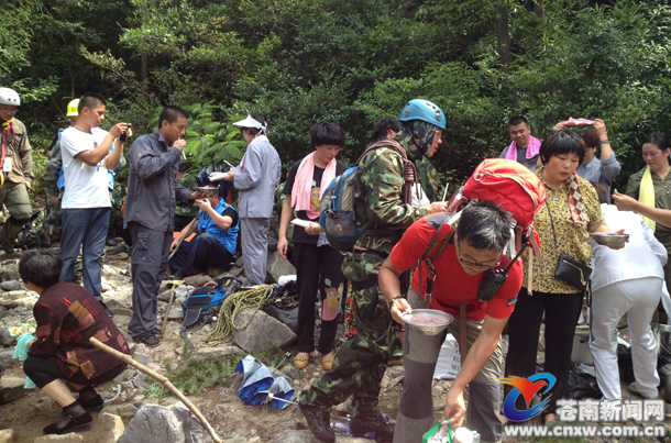 中午12时左右,骄阳炙烤着大地,室外温度已高达35度以上,在莒溪大峡谷水潭探底现场,救援人员发现不少的村民“全副武装”地向他们走来,原来今天天气太过炎热,村民们担心搜救人员酷暑难奈,体力不支无法正常开展救援行动,就自发组织起来,每家每户都烧了一大锅的白米粥给搜救人员送来。