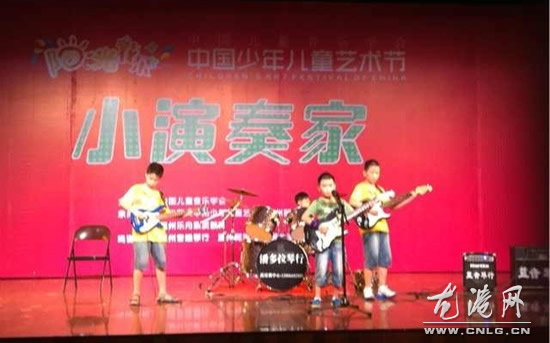 龙港网7月2日讯:中国儿童少年艺术节近日在温州东南剧院拉开序幕来自龙港的主唱陈治俊'吉他手林子涛'贝斯手黄诺贝'鼓手陈家豪组成的乐队'参加这次比赛'赢得全场热烈的掌声。