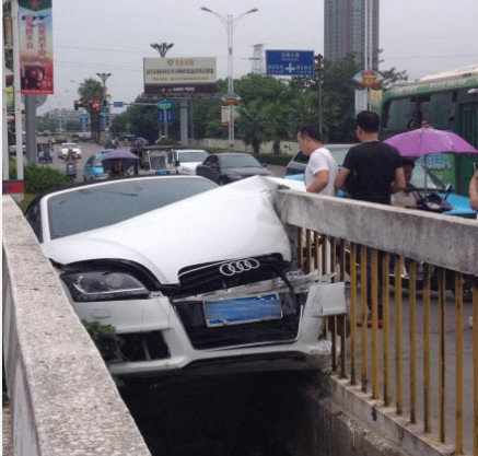 昨天,温州苍南县龙港镇龙港大道的腾龙桥,一辆敞篷跑车撞上了大桥的隔离护栏,部分护栏被“吞”进跑车引擎位置,导致车辆受损严重。当交警赶到时,驾驶员不见踪影。隔离护栏位于大桥机动车道与非机动车道之间,为水泥结构。护栏之间有一米多宽的缺口,下面约3米处就是河面。跑车车主是名女司机,苍南金乡人。据交警方面透露,截至当晚7时许,车主仍未现身。