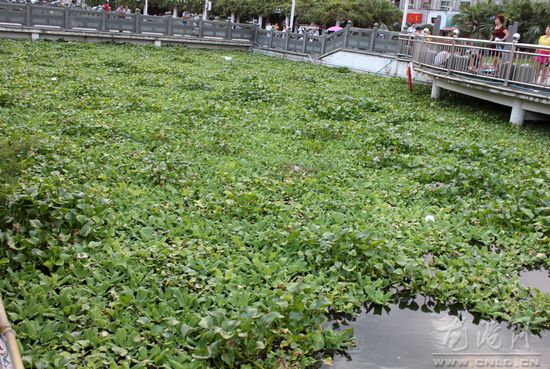 龙港网9月5日讯:近日,记者路过龙港镇金河广场,发现附近的河面上被水葫芦“填”得满满的,远看水面就像一片片“绿茵地”。河道路口也差点被堵住了。