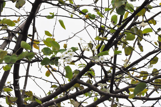 倪先生介绍,这些花已经开了五六天,这棵梨树今年2月份的时候就开始陆陆续续长花苞,不久前刚摘过梨子,现在又开始开花了。