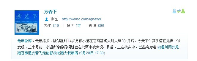 龙港网9月28日讯(陈记) 9月28日下午,有龙港网友“方岩下”微博爆料称,今年6月23日在苍南县莒溪大峡谷失踪的14岁男孩小温的头骨疑被找到。今晚7点许,本网值班编辑和苍南县壹加壹民防救援中心理事长张炳沟一起驱车赶往莒溪社区,经该社区干部证实,今天下午一游客在大峡谷龙井潭中发现一块头骨,目前苍南县公安局刑侦民警和法医已经赶到现场。头骨是否为14岁失踪龙港男孩小温,还待警方进一步鉴定确认。